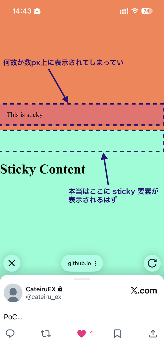 position: stickyがある場合、その要素の位置が数px上に移動し sticky が動作しない問題がある。 - iOSもしくはXのバグである可能性が高い
