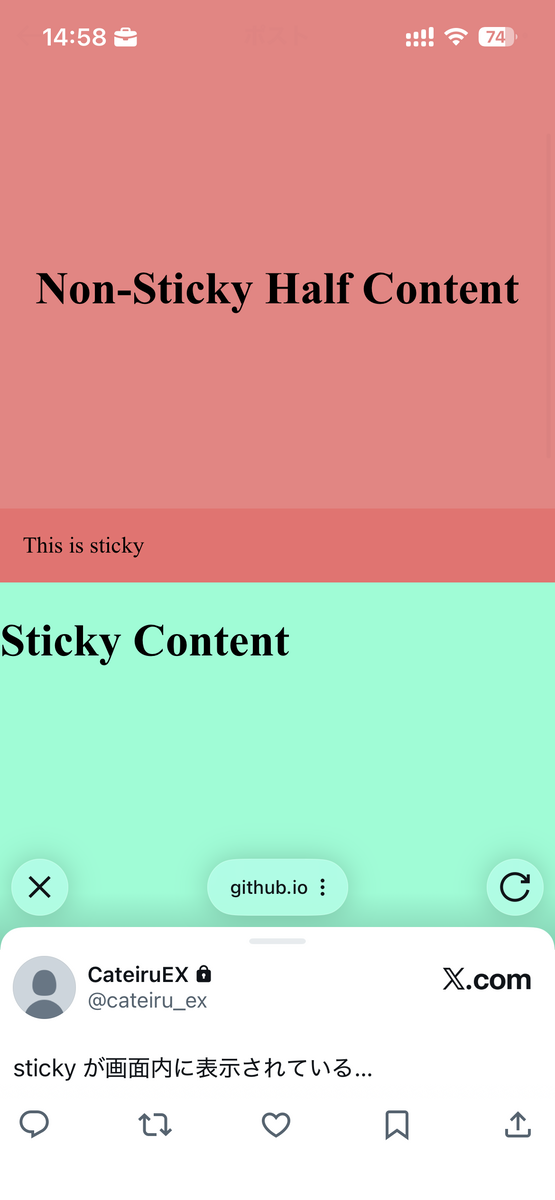 画面内に表示されたら sticky 要素をレンダリングできると良さそうです。IntersectionObserver API を使用して遅延表示します。どうやら display: none → display: block にするだけでも解決できそうだったので以下のようなスクリプトを配置してみました。